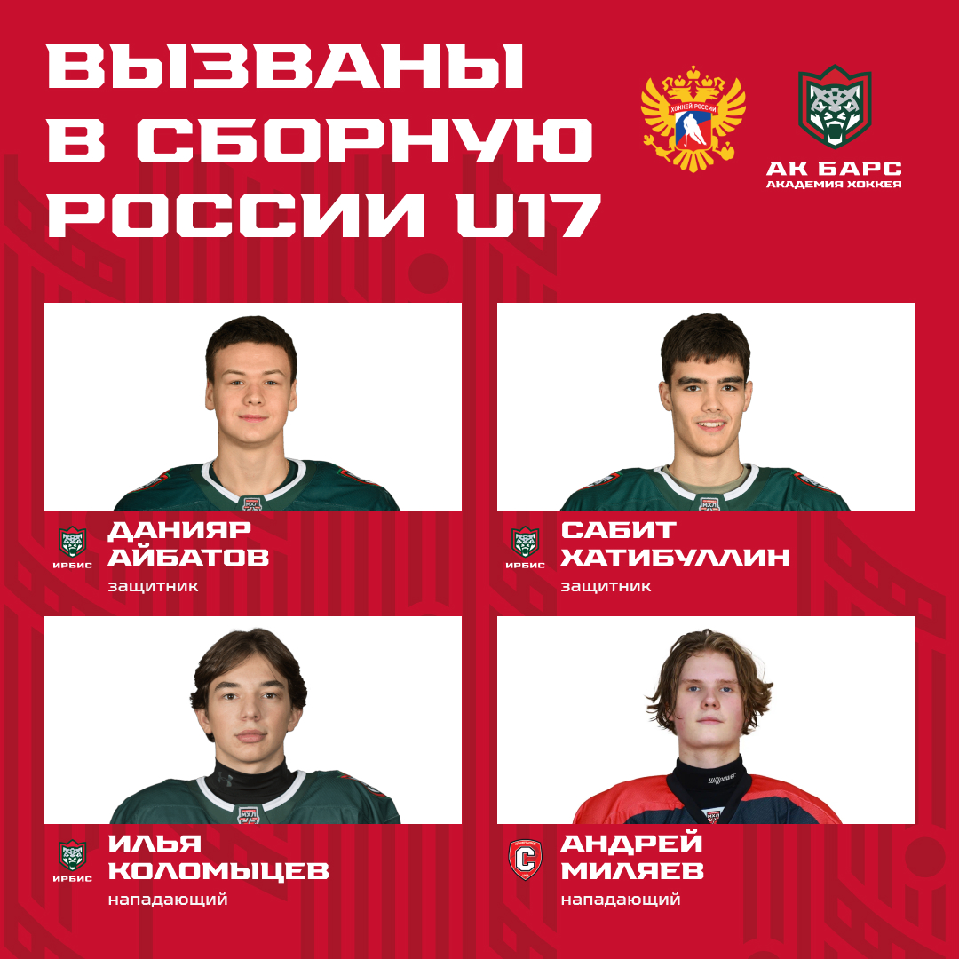 Сборная России U17 приступила к тренировкам в УТЦ «Новогорск». В состав сборной вызваны четыре наших воспитанника 2009 года рождения: защитники Данияр Айбатов, Сабит Хатибуллин и нападающий Илья Коломыцев – все трое выступают сейчас в МХЛ за казанский «Ирбис». А также нападающий Андрей Миляев, играющий за альметьевский «Спутник».