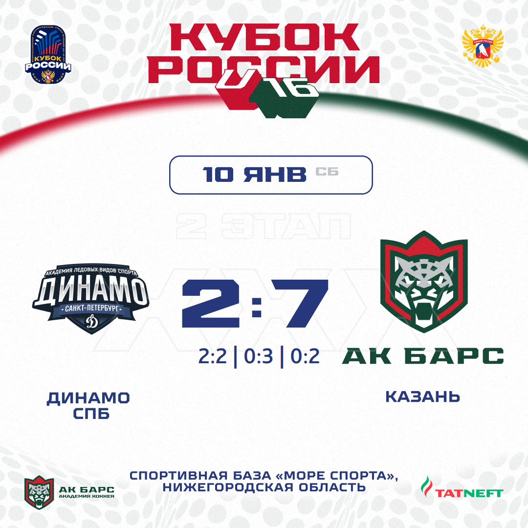 Подопечные Айрата Мирханова и Романа Вильданова одержали третью победу подряд во втором туре «Кубка России». Сегодня «барсы» уверенно обыграли питерское «Динамо» - 7:2.