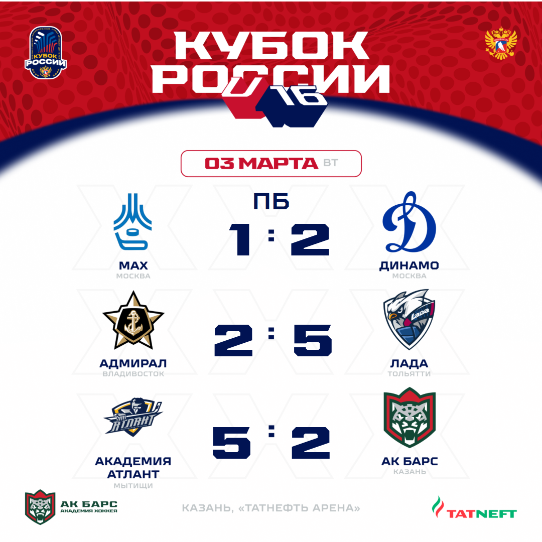 После небольшой однодневной передышки команды вернулись в «Татнефть Арену», чтобы порадовать зрителей тремя яркими поединками. Утро началось с московского дерби «Московской академии хоккея» против «Динамо». Дальневосточный «Адмирал» в ранге хозяев сыграл с тольяттинской «Ладой». А в завершениии дня «барсы» скрестили клюшки с подмосковным «Атлантом».