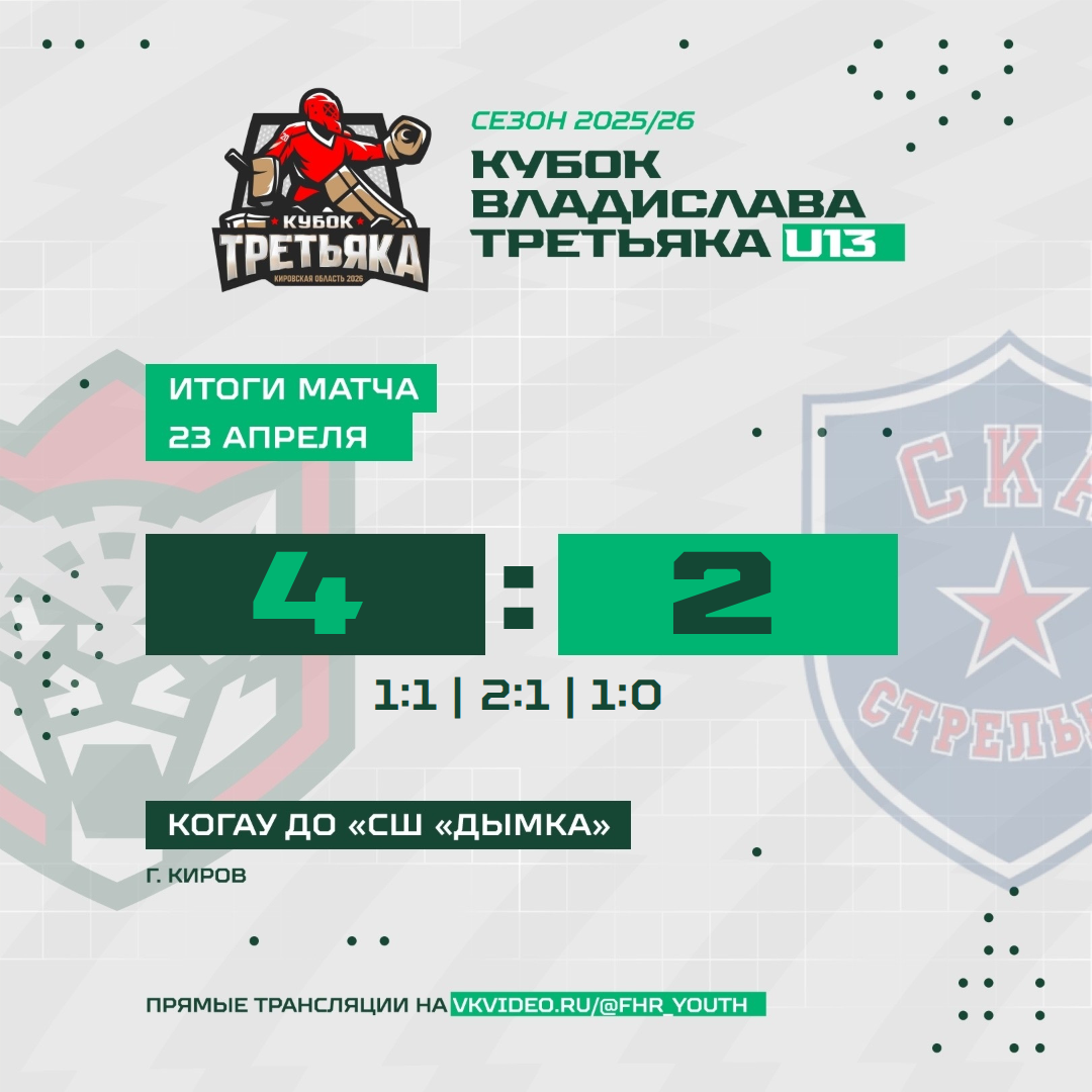 Вторая победа «барсов» на всероссийском финале.В тяжелейшей борьбе казанцы переигрывают армейцев с берегов Невы. В сегодняшнем поединке решающим фактором стала игра в неравных составах. На протяжении долгого времени счёт был равный - 1:1, а затем - 2:2. Но наши парни сумели поразить ворота соперника в концовке второго периода и вырваться вперёд. Платон Ершов точным броском забросил победную шайбу. В заключительной двадцатиминутке наша дружина надежно отыграла в обороне, а на последних секундах встречи Ярослав Рязанов отправил шайбу в пустые ворота и снял все вопросы о победителе в этом непростом поединке. Командная победа!