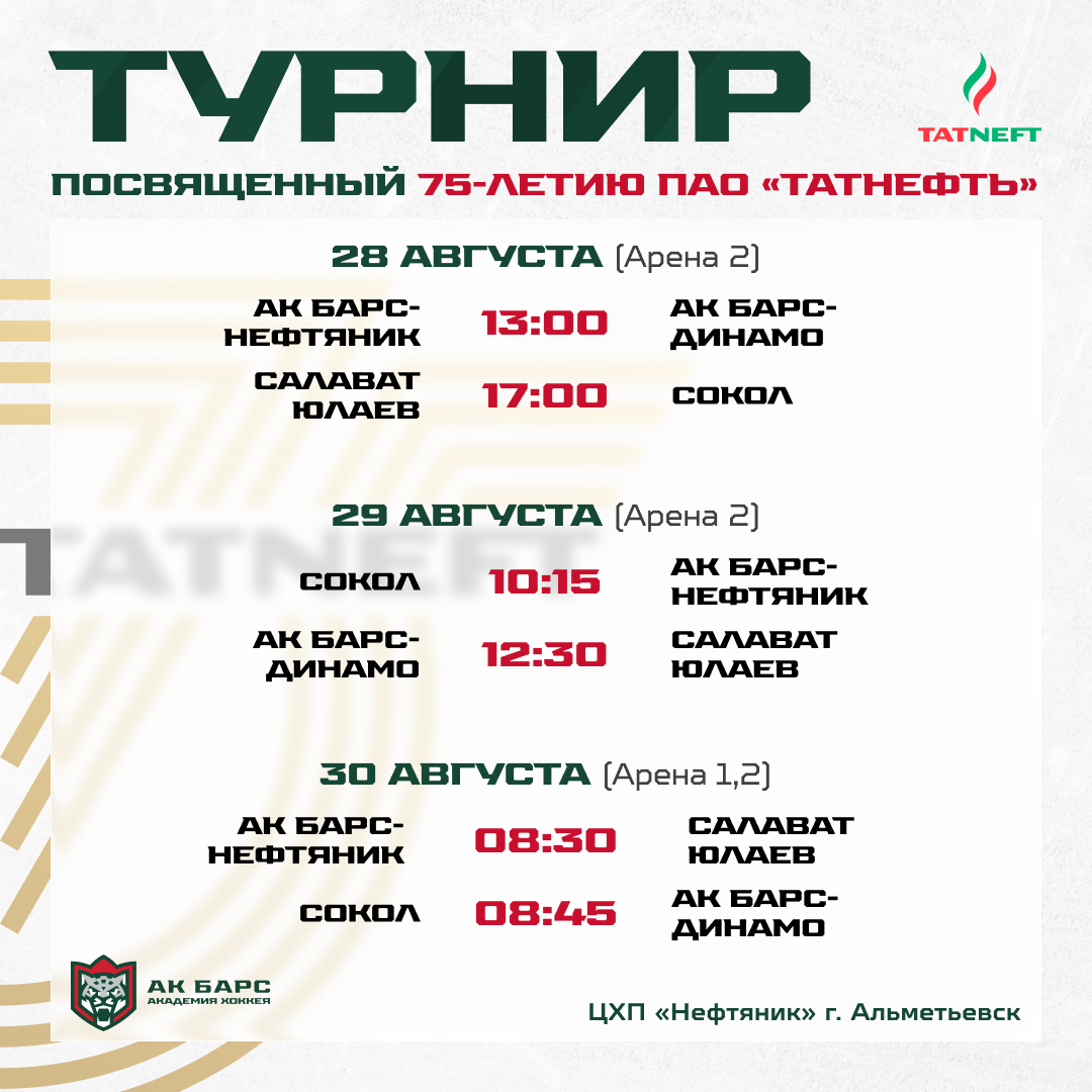 С 28 по 30 августа в Альметьевске пройдет Турнир по хоккею, посвященный 75-летию ПАО «Татнефть»